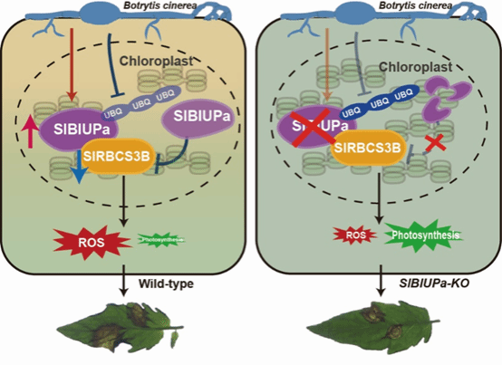 本研究鉴定了受灰霉菌诱导的未知蛋白SlBIUPa能够负调控番茄灰霉病。过表达SlBIUPa会破坏叶绿体功能,而SlBIUPa突变体则能增加叶绿体含量、减轻光合作用损伤并减少活性氧积累,从而赋予番茄对灰霉病的显著抗性。此外,通过酵母双杂钓库发现SlBIUPa与Rubisco小亚基SlRBCS3B蛋白互作,抑制其表达并降低Rubisco活性。此外,在正常条件下,SlBIUPa 通过 26S 蛋白酶体途径被泛素化降解;然而,灰霉菌感染会减弱这种降解,导致 SlBIUPa 积累并增加植物的易感性。