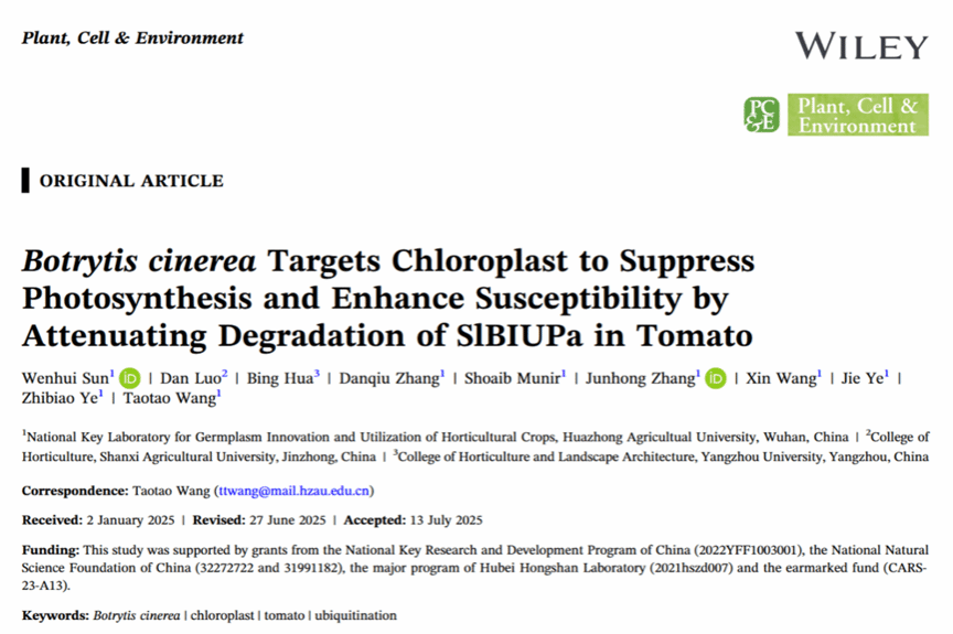 近日,英国365集团公司王涛涛课题组在Plant, Cell & Environment在线发表了题为“Botrytis cinerea Targets Chloroplast to Suppress Photosynthesis and Enhance Susceptibility by Attenuating Degradation of SlBIUPa in Tomato”的研究论文。该研究首次鉴定了 SlBIUPa 蛋白在灰霉菌侵染中的响应作用,并阐明了其通过调控 Rubisco 活性影响植物免疫与光合作用的分子途径。