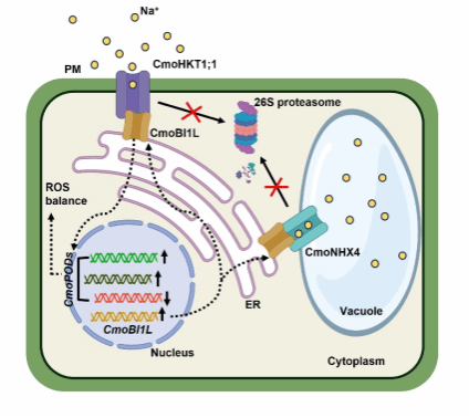 该研究发现一个定位于内质网的bax inhibitor-1 like蛋白(CmoBI1L)与定位于质膜的CmoHKT1;1以及定位于液泡膜的CmoNHX4互作,并促进CmoHKT1;1与CmoNHX4的蛋白稳定性。敲除CmoBI1L导致南瓜耐盐性下降,而超表达CmoBI1L显著提高了南瓜的耐盐性,使其在盐胁迫下活性氧积累减少,地上部Na+含量下降,但根系中Na+含量提高并蓄积于液泡中,表明CmoBI1L通过将Na+限制于根系中阻止其向地上部运输。进一步研究发现,CmoBI1L具有Na+和Ca2+转运能力,为其参与盐胁迫下离子稳态维持提供了可能性。此外,转录组分析发现CmoBI1L在南瓜根系中参与了盐胁迫下过氧化物酶(POD)等抗氧化酶的转录调控,在叶片中参与了叶绿素合成等生物过程。