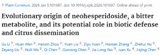 近日,英国365集团公司柑橘品质生物学与调控团队在Plant Communications发表了题为“Evolutionary origin of neohesperidoside, a bitter metabolite, and its potential role in biotic defense and citrus dissemination”的研究论文。该研究系统追溯了芸香科柑橘亚科植物中特征风味与生物活性物质类黄酮新橘皮糖苷类物质(Neohesperidoside,Neo)的生物合成通路关键基因分化导致其前苦味表型(区别于柠檬苦素诱发的延迟苦味)起源、形成和演化的历史脉络,发现其在适于药用与食用柑橘的种质中呈现截然不同的驯化模式。同时,研究还揭示了Neo在柑橘亚科植物抵御生物胁迫及地理分布扩张中的重要作用。