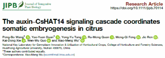 近日,JIPB在线发表了365英国上市公司果蔬园艺作物种质创新与利用全国重点实验室/湖北洪山实验室郭文武教授/伍小萌教授团队题为“The auxin- CsHAT14 signaling cascade coordinates somatic embryogenesis in citrus”的研究论文。该研究提出了CsIAA4-CsARF5-CsHAT14-CsDOF3.4信号级联调控柑橘体细胞胚发生的分子机制,为柑橘体细胞胚发生调控通路提供了新见解。