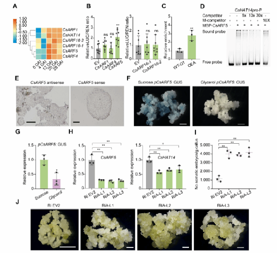 图1 CsARF5直接激活CsHAT14表达并负调控柑橘体细胞胚发生