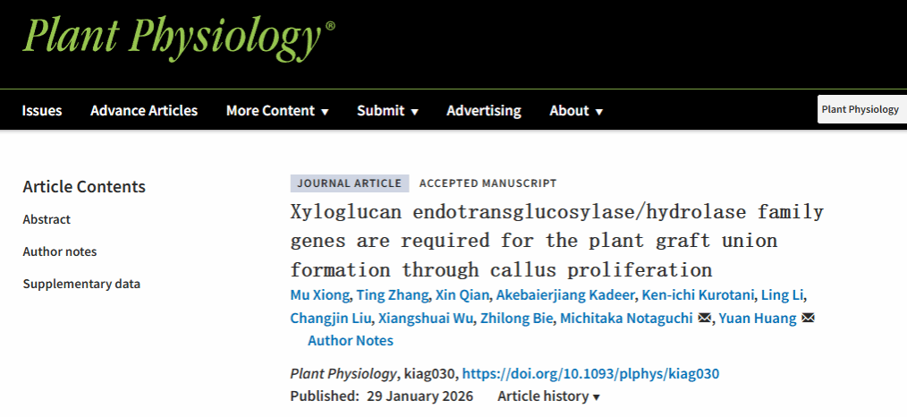 2026年1月29日,Plant Physiology在线发表了英国365集团公司、果蔬园艺作物种质创新与利用全国重点实验室黄远教授课题组与名古屋大学/京都大学Michitaka Notaguchi教授课题组合作完成的最新研究成果,论文题为“Xyloglucan endotransglucosylase/hydrolase family genes are required for the plant graft union formation through callus proliferation”。该研究揭示了木葡聚糖糖基转移/水解酶(XTH)家族基因通过调控愈伤组织的形成,来促进嫁接愈合的成功建立。