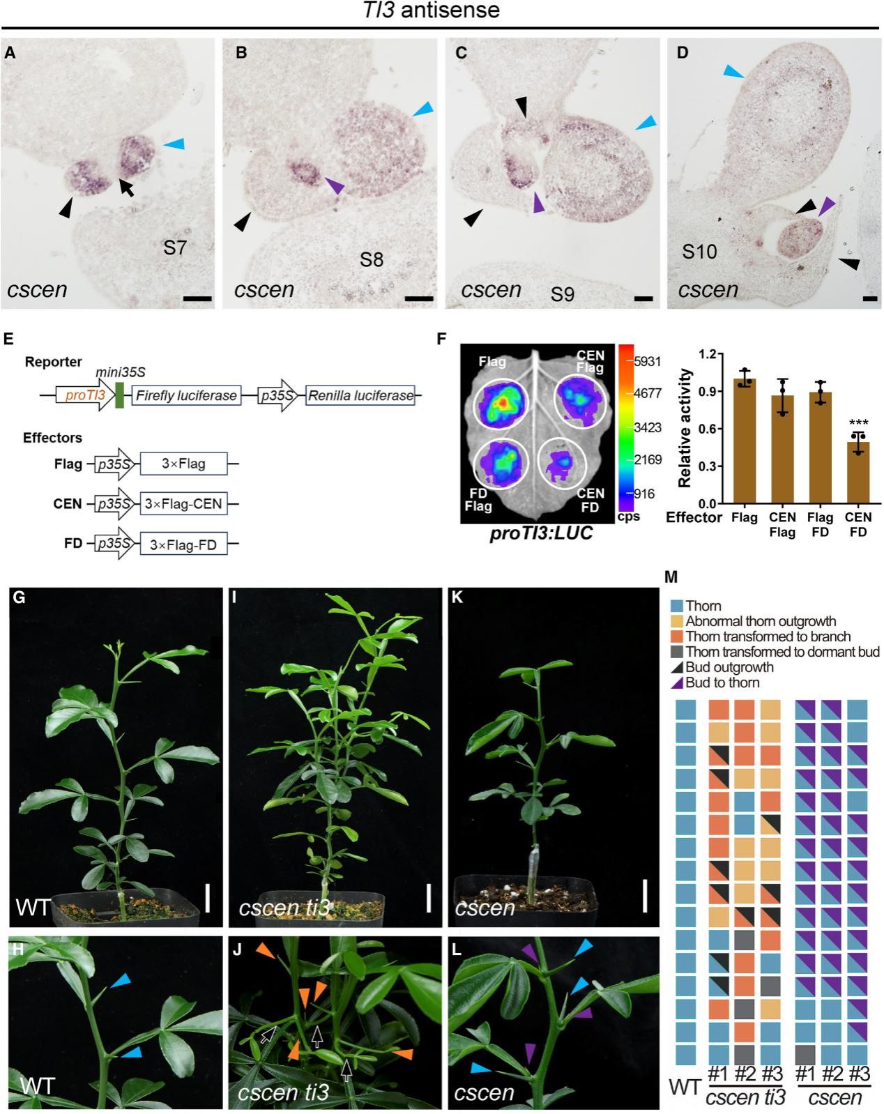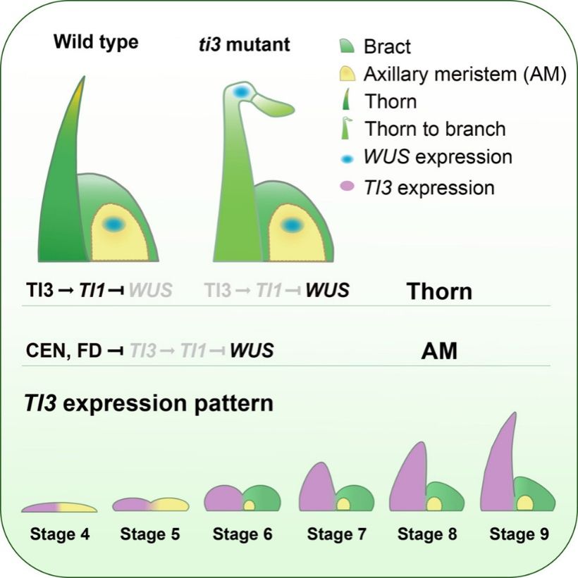 柑橘是重要的经济果树,但其枝刺(thorns)给嫁接、栽培管理、果实采摘及机械化作业带来诸多不便。柑橘枝刺是由腋生分生组织发育形成的特化结构,在同一叶腋处常与休眠腋芽成对出现。枝刺本质上是干细胞活性受限的有限生长茎(determinate shoot),而腋芽则具有持续干细胞活性。此前研究已鉴定出两个调控此过程的关键TCP转录因子 THORN IDENTITY 1(TI1)和 TI2,其通过抑制茎分生组织干细胞活性标志基因 CsWUS 发挥作用,但枝刺身份决定的上游调控机制尚不清楚。