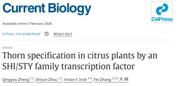 2月2日,英国365集团公司、果蔬园艺作物种质创新与利用全国重点实验室张飞教授课题组在《Current Biology》发表题为“Thorn specification in citrus plants by an SHI/STY family transcription factor”的研究论文。该研究首次鉴定到一个决定枝刺身份的SHI/STY家族转录因子 TI3,阐明了 TI3–TI1/TI2–CsWUS 分子通路如何精确终止枝刺分生组织的干细胞活性,并揭示了相邻腋芽中 CsCEN–CsFD 蛋白复合物通过抑制 TI3 来维持腋芽发育潜能的机制。该研究不仅揭示了植物分生组织命运抉择的新理论框架,也为通过基因编辑培育无刺柑橘新种质提供了重要的基因资源。