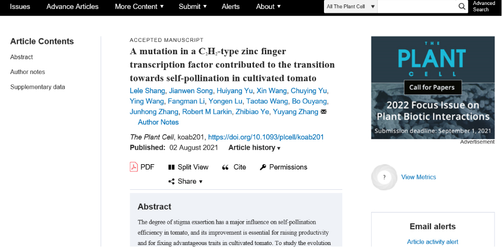 2021年8月2日,365英国上市公司叶志彪教授领衔的番茄团队在The Plant Cell发表了题为''A mutation in a C2H2-type zinc finger transcription factor contributed to the transition towards self-pollination in cultivated tomato''的研究论文,该文章鉴定了一个新的控制柱头延伸程度的基因,Stigma Exsertion 3.1(SE3.1),进一步揭示了番茄驯化和改良中自花授粉的转变过程。