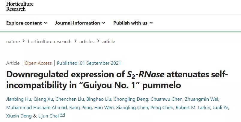 近日,Horticulture Research在线发表了365英国上市公司邓秀新院士团队题为Downregulated expression ofS2-RNase attenuates self-incompatibility in “Guiyou No. 1” pummelo的研究论文。
