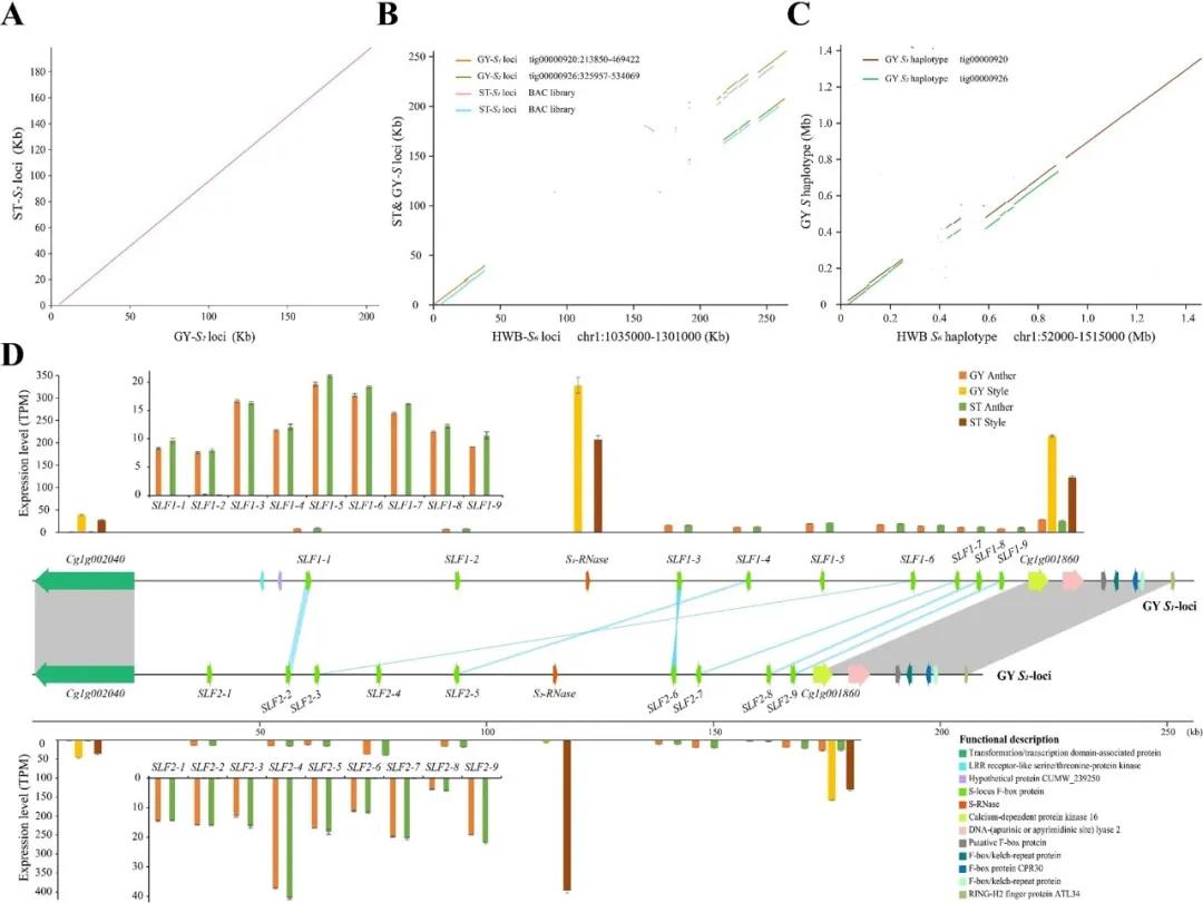 为了进一步解析“桂柚1号”自交亲和的分子机制,本研究基于三代PacBio测序平台,对“桂柚1号”进行了全基因组测序,共得到3969910472条subreads,经分型组装,得到566.29 Mb包含两个S单倍型的基因组序列。并对得到的S1和S2两个单倍型的序列信息进行了手动注释。与已经发表的沙田柚S1和S2单倍型相比,发现在控制柑橘自交不亲和的S位点上,“桂柚1号”与沙田柚在序列上并不存在差异,该位点上也并未检测到Indels和结构变异(SVs)。且发现造成“桂柚1号”自交亲和的S2-RNase基因上游启动子区域(5kb)及下游非编码区(5kb)在“桂柚1号”及沙田柚中,序列完全一致,并无SNP的差异。全基因组甲基化分析也显示,“桂柚1号”和沙田柚花柱中甲基化水平并不存在显著差异,其中甲基化相关基因和去甲基化相关基因的表达也无明显差异。由此表明,“桂柚1号”中S2-RNase基因的不表达并非由于序列变异和表观甲基化修饰所导致。
