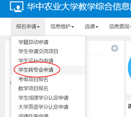 1.登录“教育教学在线”系统,点击“学生转专业申请”。