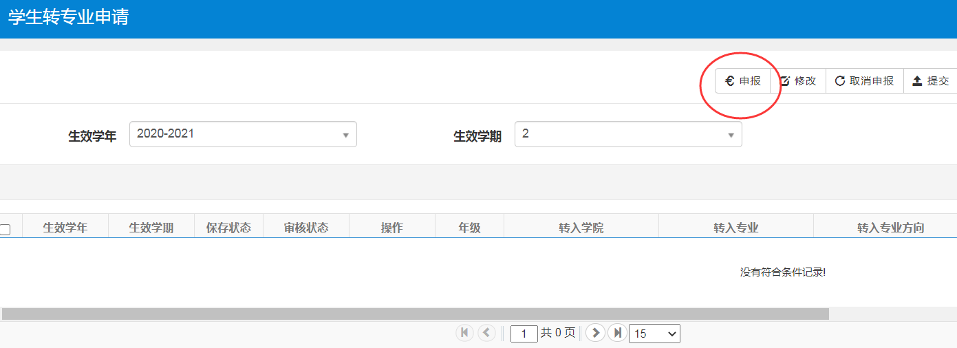 2.点击“申报”,进入转专业申请界面,选择转入学院和专业,上传附件材料,填写理由,点击 “提交申请”。(因特殊原因申请转专业需提供相关附件材料。)