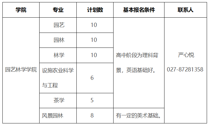 3.审核录取。园林、园艺、林学、设施农业科学与工程、风景园林专业综合面试成绩和学生第一学期(2024级)课程成绩,或前三学期(2023级)课程成绩,按照面试成绩*60%+GPA*25*40%比例计算学生总成绩,依据总评成绩和专业招生人数,择优录取;茶学专业根据学生第一学期(2024级)或前三学期(2023级)课程成绩GPA排名和招生人数,择优录取。公示后报本科生院备案,由学校统一审核录取。
