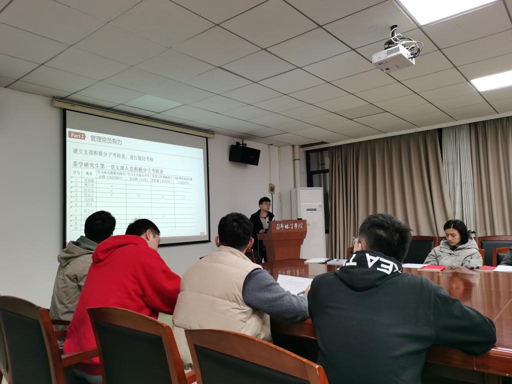 会议上,党支部书记晏智首先进行了2020年度茶学研究生第一党支部工作汇报。2020年,党支部定期进行党内理论学习并积极撰写学习心得,坚持党员管理规范与党员义务,积极参与各类组织管理工作与班风学风校风建设,有效地宣传支部信息,并且组织参与多项有意义的支部立项活动,严格按照“七个有力:教育党员有力、管理党员有力、监督党员有力、组织师生有力、宣传师生有力、凝聚师生有力、服务师生有力”进行支部建设。