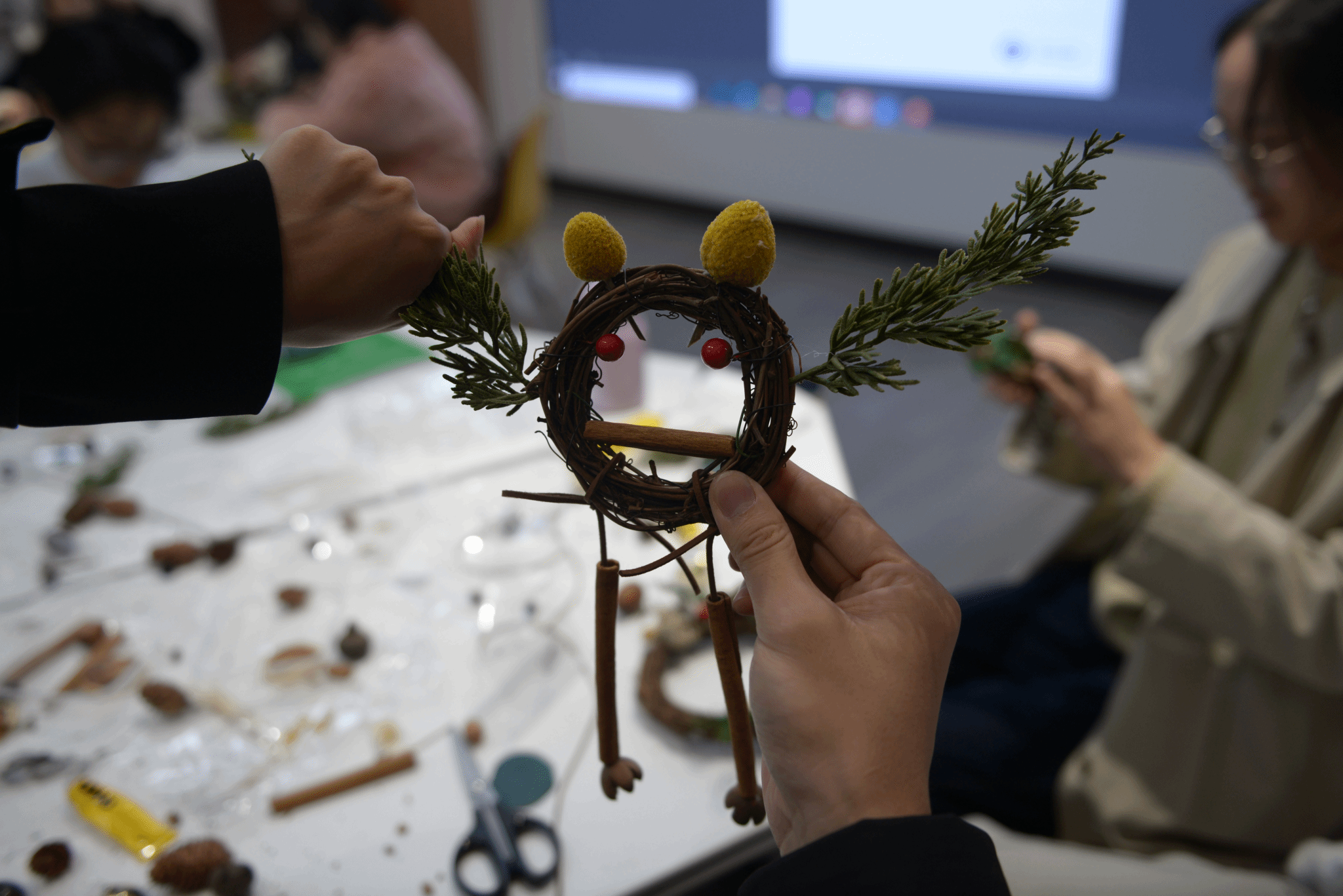 最后,活动负责人林志颖给大家介绍了桌子上为大家准备好的花材和花艺工具,指导同学们根据自己喜好与需要选择花卉材料,自行发挥想象力,创作出专属于自己的精美的秋日花环。