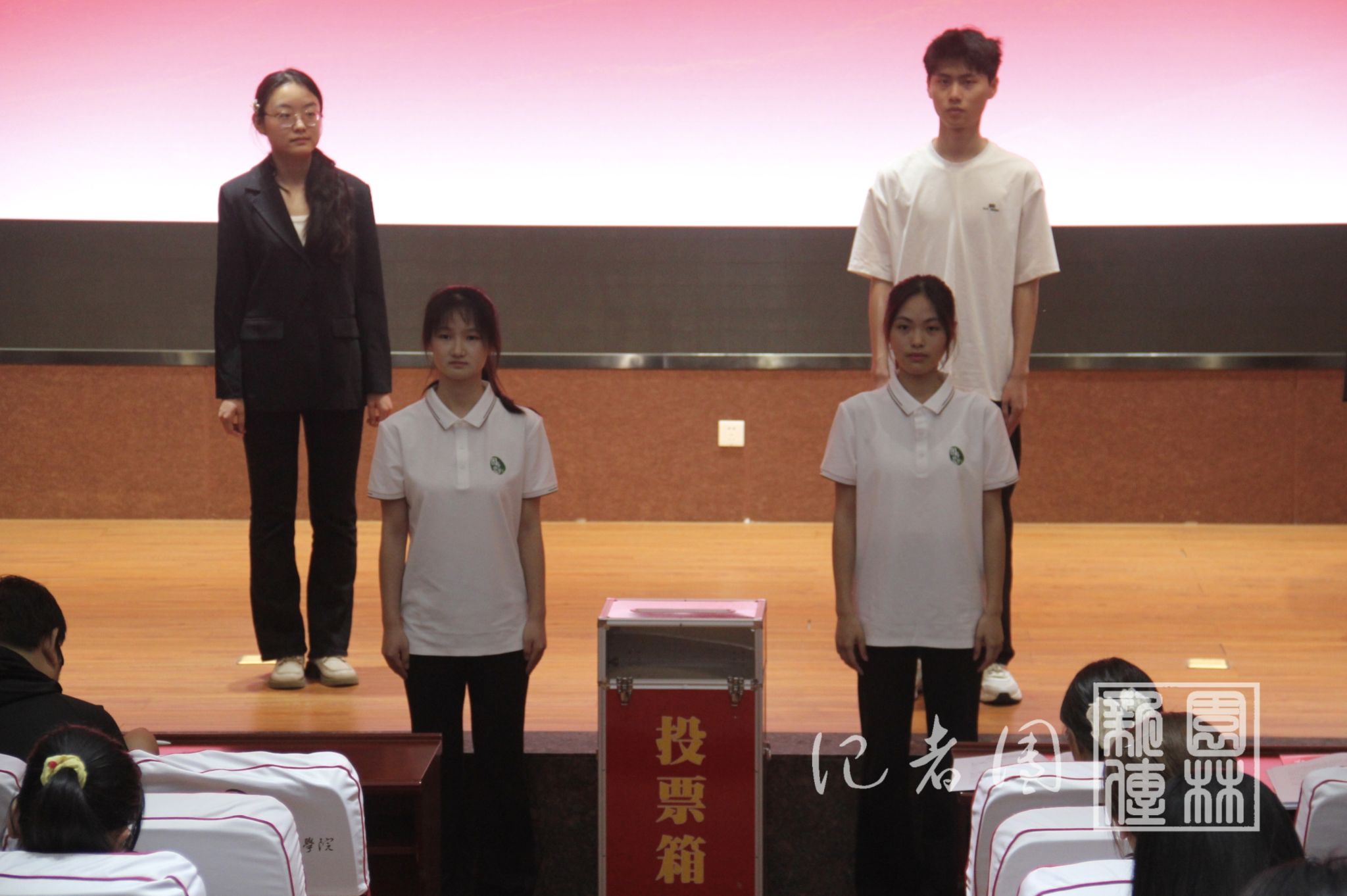 4月23日中午十二点,我院第八次学生代表大会第一次会议于园林北楼228报告厅召开。本次会议由邱小雨主持,辅导员郭艺佳、杨子萱、方姝灵出席此次会议,校主席孟响、彭澍荣参会。本次会议通过无记名投票的方式,最终选举产生了吴越、贾超涵、阿依奴木·波拉提别克等22名学生代表。