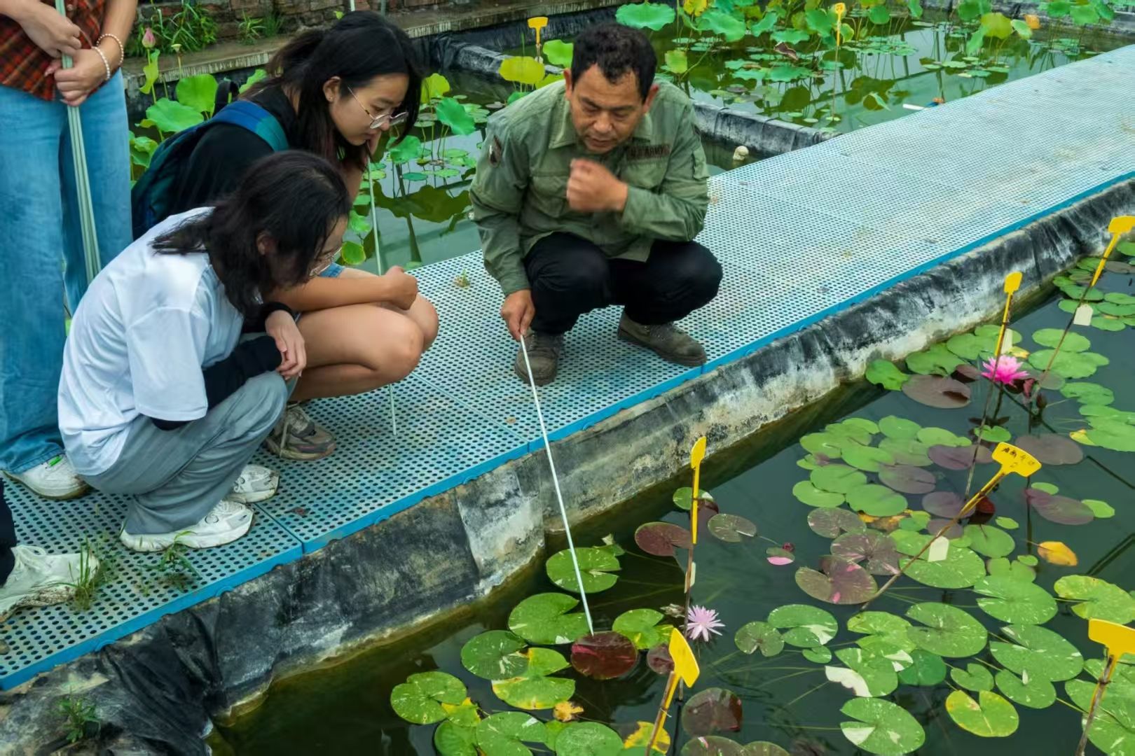 实践开始,来自合肥市植物园科普中心的宇胜老师便为团队成员介绍了如何选择具有潜力的新品种进行记录,考虑因素包括花冠颜色、直径、雌蕊雄蕊发育状况等。随后他带领成员步入研发区深处,为团队成员推荐了几株花色明艳、形态优美的荷花。“最好选择花苞多数的记,我们做新品种要观察性状和花期,就算是同一株上的,花瓣数和雄蕊数也经常不同,多记些数据充分充分。”他介绍到,“花与伴生叶的相对高度也值得记录,一般来说,花显著高于叶的品种观赏价值更高。”成员们纷纷响应,并为自己选择的荷花睡莲插上标识杆,写上信息牌。“大家的标牌要记录日期,花瓣数和株型,别忘了加上自己的名字。”百莲百荷基地的管理员胡耀辉补充道。