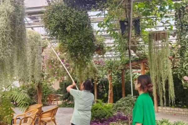 当日上午八点半,茗赏百花厅温室负责人王师傅拉好水管,手持喷管,向团队成员展示了温室植物养护的日常浇水工作。由于垂吊花卉位置较高,水壶浇水或智能喷洒装置难以施展,此项工作只能依靠人工完成。王师傅一边操作,一边向团队成员讲解浇水时的注意事项,如水流大小、浇水频率等,成员们认真聆听,不时提出疑问,王师傅都耐心解答。