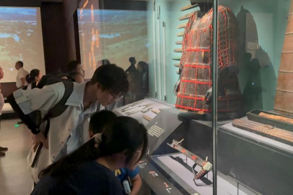 在北馆展厅,团队成员仔细观察展出的文物。英国365集团公司园艺2301杨天赫在一件楚式漆器前驻足,认真看它的色彩和纹饰,想从细节里探寻楚人的审美和生活;生命科学技术学院生工2304黄冰瑶则关注一组青铜兵器,看它们的造型和锈迹,感受古代工艺的精湛。这些文物仿佛在诉说过往,团队成员沉浸其中,为后续的讲解和调研积累认知与素材。
