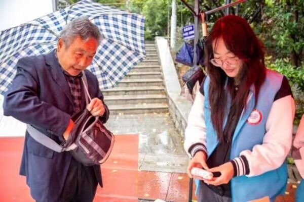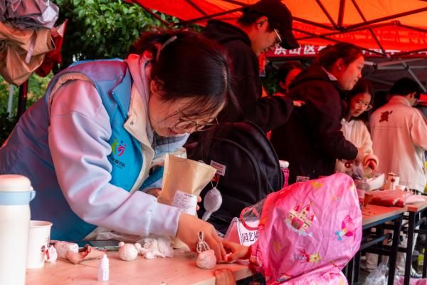 阴雨绵绵,但社区居民和志愿者的热情丝毫不减。居民们有的身着雨衣,有的手撑雨伞,摊位前人潮络绎不绝。在志愿者的示范下,社区居民不论年老年少,纷纷动手体验粘土桂花香挂的制作。孩子们用稚嫩的双手肆意创作,将干桂花揉捻进入粘土各处,捏出各式各样的形态;长辈们则耐心细致地点缀干桂花、调试桂花香精,让香气在泥坯中慢慢浸润,满溢人群之间。现场欢声笑语不断,小小的手工桌成了代际交流的温馨桥梁。当一个个精致的桂花香挂从手中诞生,居民们脸上满是成就感。它们或是被居民带回家中,成为重阳佳节里别致的装饰;或是被赠予社区高龄老人,让手工的温度与桂花的馥郁一同传递敬老深情。