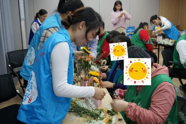 “现在就有请志愿者们为大家分发待会儿会用到的花材、花盒和花泥等材料吧,期待大家的作品哦!”黄灿灿的向日葵、温柔的康乃馨、俏皮的非洲菊......拿到花材的学员们在志愿者的引导下开始尽情创作。“这种手提式的插花作品呢,我们一般会欣赏它的四面,所以我们可以观察一下哪一面比较空,适当做一点补充。”志愿者耐心地为“大朋友”补充讲解,协助大家更好地完成作品,现场花香四溢,大家的创作热情也充斥着整个教室。