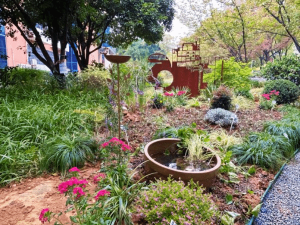 园林2302班唐思琪等11人小组设计的花园以“灵溪畔·万物生”为主题,既传承古人“师法自然、融于自然”的人文精髓,又紧扣现代“人与自然和谐共生”的生态理念;既延续老花园“山水间·焕新生”的内核,又发掘出新花园“生命之源”“万物有灵”的巧妙释读,旨在为师生打造一方处处涌动生机的秘境。