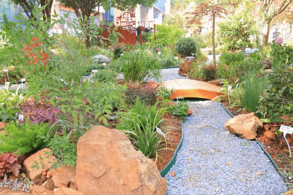经过两个班艰苦卓绝的施工营建,花园最终很好地完成了主题的呈现:灵溪是全园的“生命纽带”,通过枫与桥,碰撞出最经典的东方浪漫。溪畔草木洋溢天真:细叶芒摇岸映水,灯心草临溪伫立,蝴蝶花越溪跨桥;香蜂草探身摩挲生香,熊猫堇铺点灵动足迹,狐尾天冬垂落蓬松尾羽。偶有松鼠嬉于枝头、蝴蝶绕花翩跹,动物意象的植物与真实的生灵相融,让“万物生”的景象鲜活落地。入得此园,踏石沾晨露,听风穿草木,抬头低眼之间:画架下滴落着调色盘(矾根)、喂鸟台下预备着水草缸,低头更能寻到石缝间的虫鸣轻吟。人与自然相望相伴,不再是自然的旁观者,而是共生的参与者,完美诠释“灵溪畔·万物生”的和谐之境。