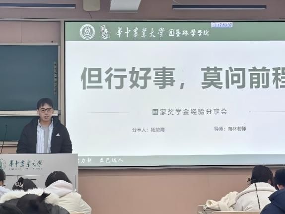 活动以国家奖学金获得者的经验分享为主线。2023级观赏园艺硕士生周雯洁分享了其在本科期间和硕士期间获得国家奖学金的科研心得,她以自身研究为例,强调科研需“敢于设想、勤于试错”,通过持续实验与修正逐步接近真相。她指出,良好的科研习惯在于细致记录、定期复盘,并重视与导师、同门的交流协作。此外,她认为科研之余应通过阅读、运动等方式保持输入与输出,维护个人成长的节奏与内核。