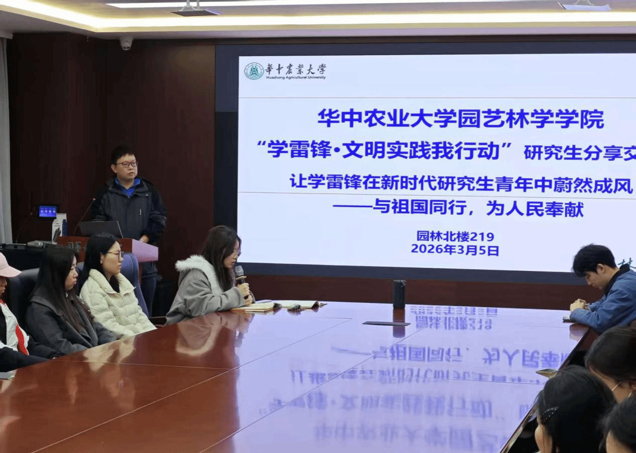 3月5日下午,园林院研究生主题学习活动在园林楼219室举行。活动以“传承雷锋精神 践行志愿初心”为主题,通过观看宣传片、重温重要回信精神、交流研讨等环节,引导广大研究生骨干深刻领悟雷锋精神的时代内涵,在服务奉献中成长成才。