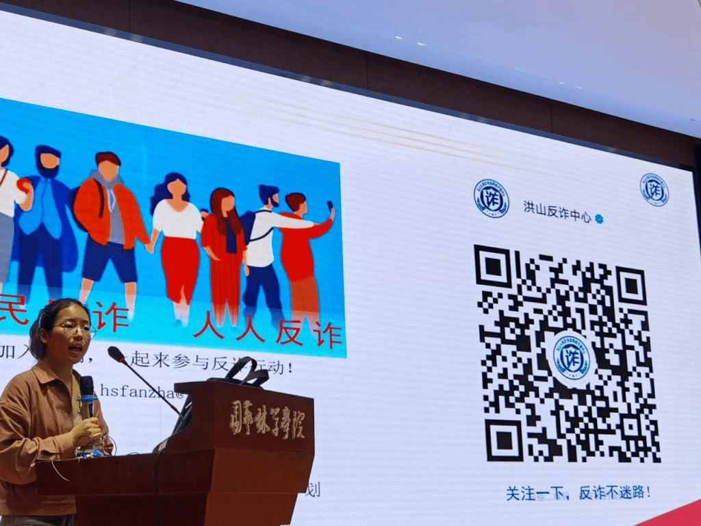 接下来,贾学菊同学结合实例讲解了冒充快递客服诈骗、“杀猪盘”诈骗、冒充公检法诈骗等诈骗类型,并分享了最近发生在贾学菊朋友身上的电信诈骗实例,给在场师生留下了深刻印象。过程中,贾学菊还给大家介绍了国家反电诈中心的专用号码“96110”及洪山区反诈中心官方号。