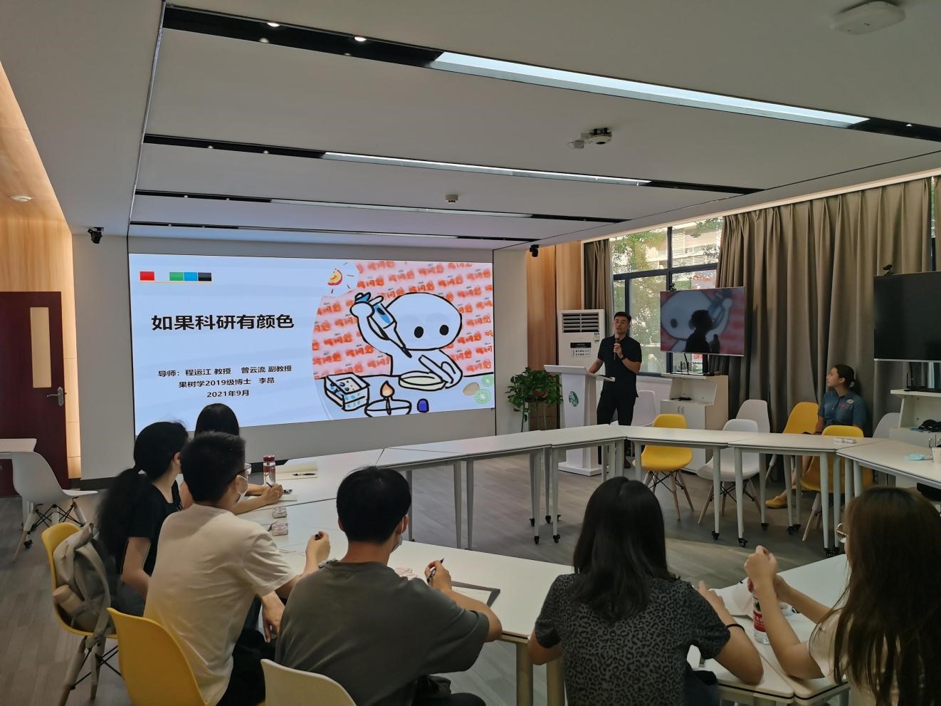 分享会上,李昂先分享了自己的科研心路历程,讲述了自己从“爱懂不懂”到“不懂装懂”最后到“不懂求懂”的心理变化,这三个状态的转变也是他从科研新人到科研达人的蜕变,他在科研中逐渐发现乐趣并乐在其中。李昂分别用红色、白色、绿色、蓝色、黑色、金色来阐述自己对于科研的理解——红色代表的是为党、为国家、为人民做科研的初心;白色代表的是科研纯粹的特点;绿色代表的是研究对象果树的顽强生命力;蓝色代表的是科研像蓝天一样广阔充满未知;黑色代表的是科研像无垠黑夜,有时会遇到困难让人失落,但通过努力最后会迎来破晓一刻;金色代表的是科研可以让大家收获成长和荣誉。