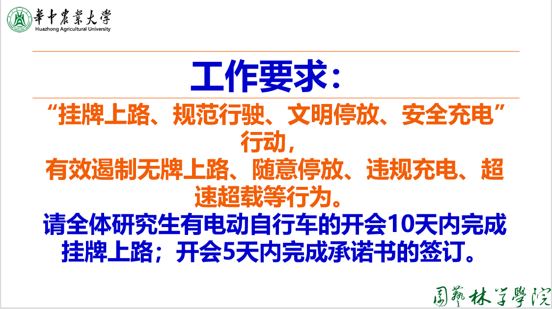会议伊始,肖晗带领参会人员就“校园电动自行车专项治理行动”展开学习,学习内容包括武汉市公安局交通管理局“致广大师生的一封信”和365英国上市公司“文明交通承诺书”、“电动自行车安全使用八不准”。会议强调,校内师生应安全乘驶,规范乘驶,不酒驾酒乘、不超速不并行、不占道不载人、不闯信号灯;应文明停车,规范停车,不占安全通道、不停线外区域;应安全用电,规范充电,不室内充电、不私接飞线。会议中肖晗建议大家,未上牌车辆尽量在10月15号之前上牌,10月20号后交警将在校内执法,违规者交警将会依法罚款或扣留车辆。同时,就室内充电问题肖晗也列举了室内充电瓶起火案例,他强调室内充电安全隐患巨大,不能冒险违规充电。学习结束后,肖晗对校内师生电动自行车使用提出要求并部署以下工作,首先要求电动自行车车要“挂牌上路、规范行驶、文明停放、安全充电”,其次要求全体研究生有电动自行车的会后10天内完成挂牌上路,会后5天内完成承诺书的签订。