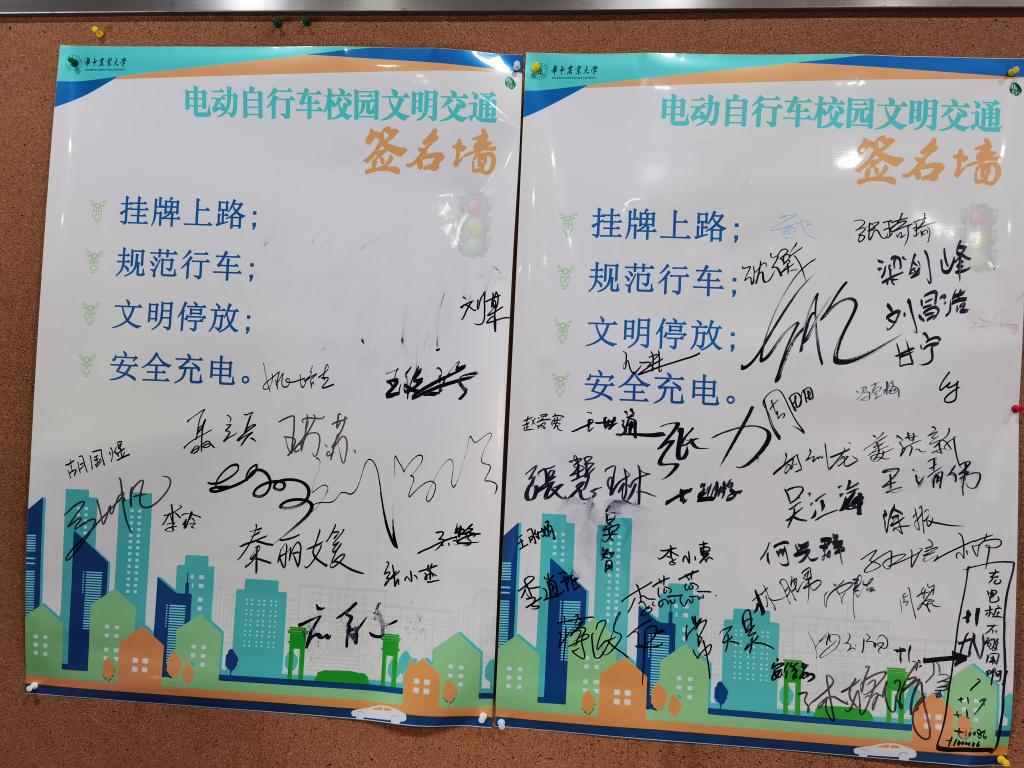 学院研究生、本科生自发在电动自行车校园文明交通签名墙上主动签名,自觉践行会议精神。