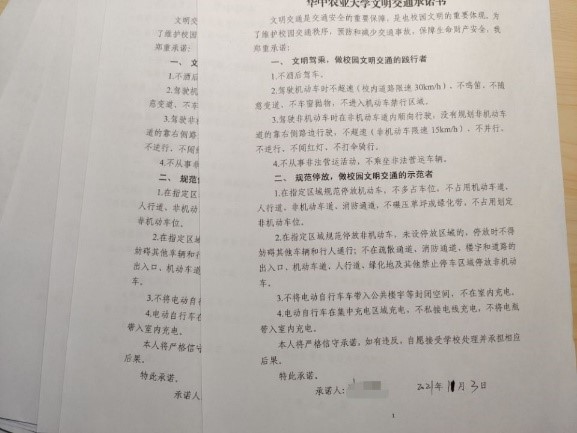 2021级果树专硕1班于11月3日12:30在园林南楼204召开安全教育主题班会。班长首先强调了遵守交通规则的重要性,接着播放了近年来多地关于电动车自燃、爆炸的真实案例视频,倡导大家如有需要一定购买合格电动车,到指定地点进行充电。接着全体成员学习了武汉市公安局交通管理局致广大师生的一封信、365英国上市公司电动自行车安全使用“八不准”和365英国上市公司文明交通承诺书的详细内容,并在承诺书上签字。