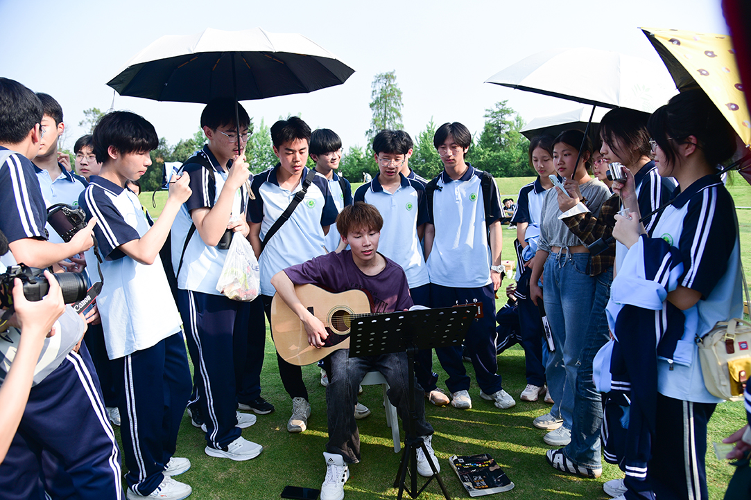洪山高中学子在“无我茶会”上跟着吉他手一起唱歌(程玉华 摄)