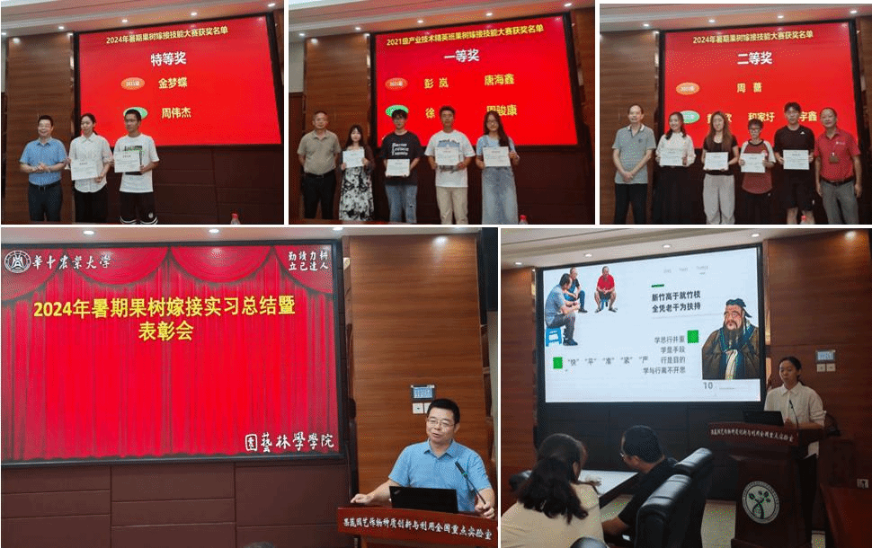 8月26日上午,2024年果树嫁接教学实习总结暨表彰会在园林南楼206会议室内召开,学院党委书记龙健飞应邀出席会议。刘军伟老师主持会议,他首先对实习概况进行了介绍,接着由6组同学分别代表各自小组进行了实习交流汇报,一幕幕精心记录和编排的幻灯片和视频场景,直观地呈现了老师们耐心传授和学生们刻苦操练的精彩瞬间,更是道出了他们在实习过程中收获的宝贵经验、深邃感悟和弥足珍贵的友谊。同学们还从各自的学习体会出发,反思了实习过程中的不足之处,并探讨了未来技术发展的方向。精美的手绘插画或视频的充分展示这段时间的实习成果。值得一提的是,2021级园艺(基础理论精英模块)同学分享了关于柑橘无刺的研究进展,期望未来能在砧木遗传改良中贡献力量。小组汇报结束后,龙健飞书记和实习指导老师分别为嫁接竞赛获奖同学颁奖,金梦蝶和周伟杰斩获特等奖,徐陆等同学荣获一等奖,和家圩等同学获得二等奖。
