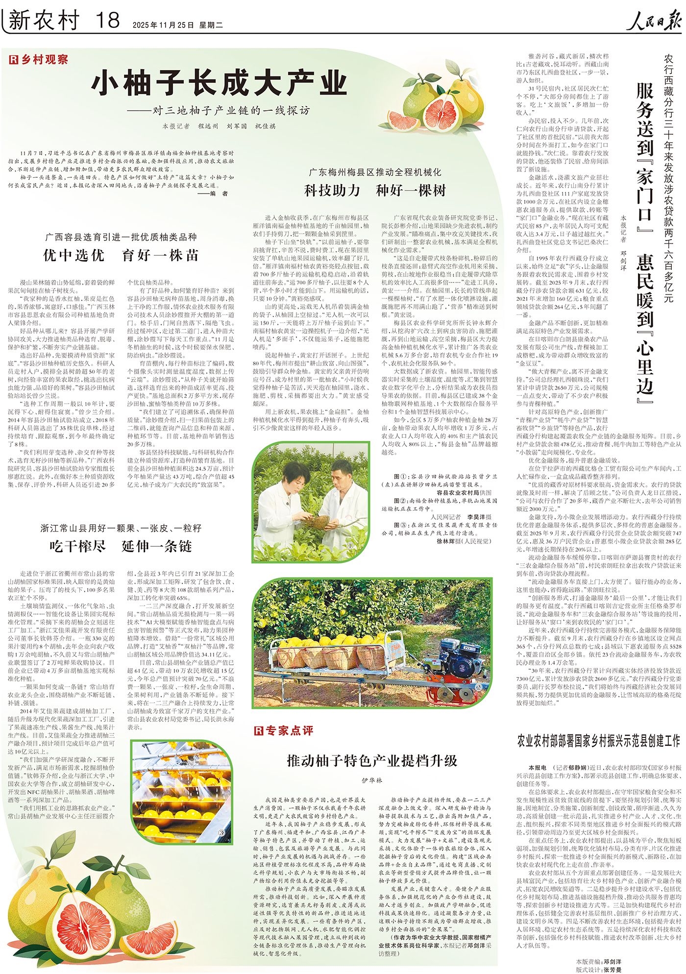 发展产业,关键靠人才。要健全产业服务体系,加强规范化的产业合作社建设,鼓励人才返乡创业。加强政产学研融合,促进科技成果快速转化。通过凝聚各方力量,让这颗小柚子持续不断成为带动群众增收、推动乡村全面振兴的“金果果”。
